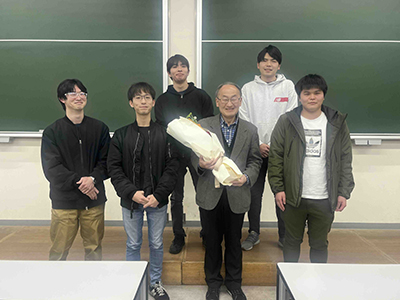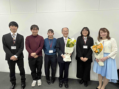 渡邉研の卒業生たちの中には、先生と同じ分野に進まれて専門職に就かれた方も少なくありません。最近の卒業生でも、渡邉研で身につけた技術を使う仕事をしているという学生たちが何人もいます。卒業生が何人も花束やお祝いを持って駆けつけてくれました。