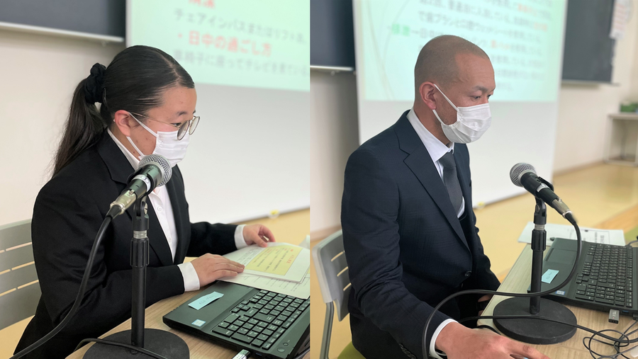 介護課程Ⅳでは、実習先でチームアプローチの重要性を認識し、介護課程に活用、応用できる実践力を学びます。実習先で、実際に担当させていただいた利用者様に対しての介護課程を文章化し、それぞれの事例を学生一人ひとりが授業の最終回でプレゼンテーションします。