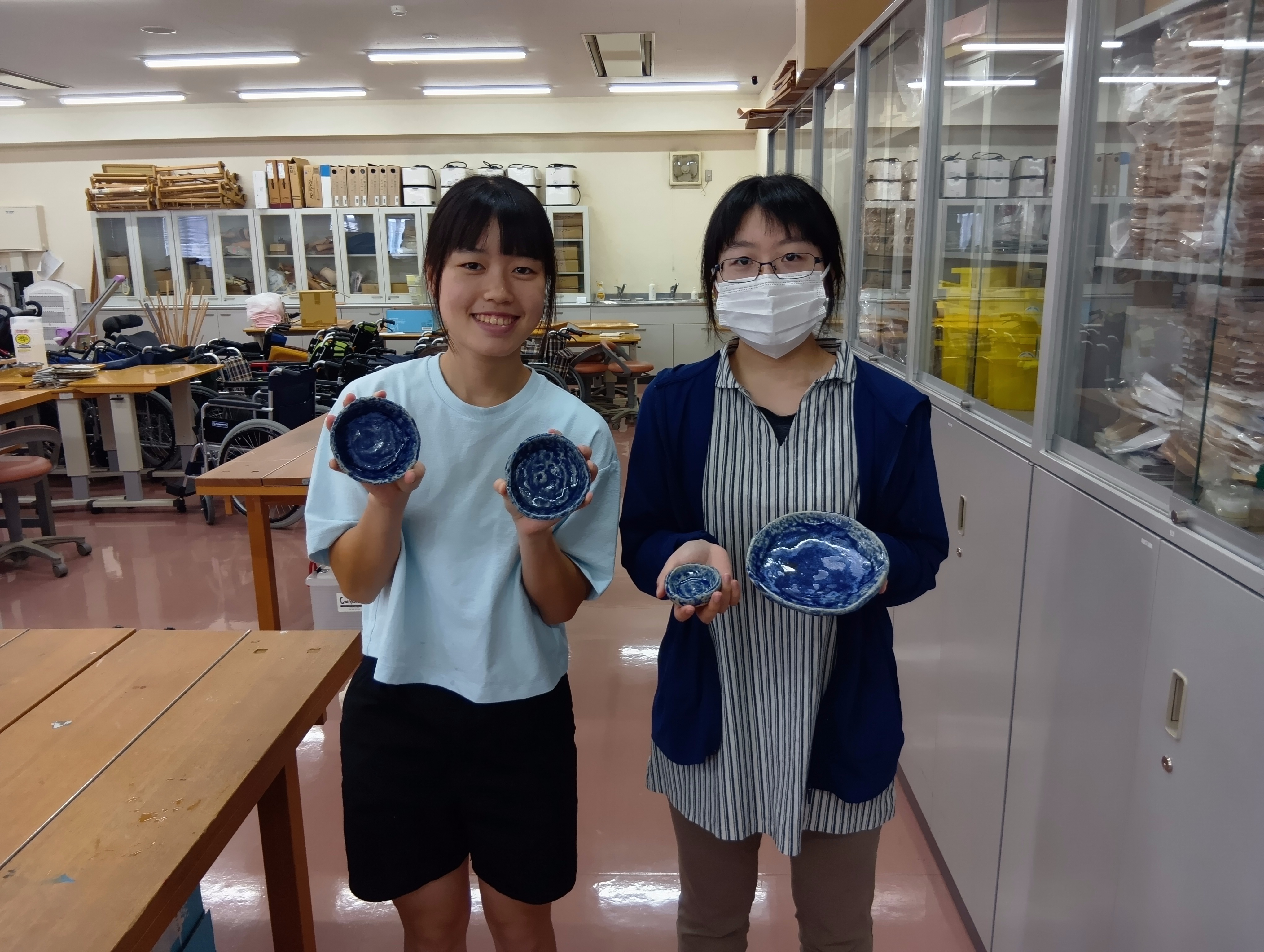 陶芸と作業療法 作業療法学科のアクティビティ実習室には、陶芸の焼き釜が設置されています。陶芸は、古くから作業療法の活動で利用されています。治療効果も身体面、精神面いずれにもあり、また維持期における生活の質の向上に関わる趣味活動の開発にも最適です。他の大学では、陶芸種目は作業療法士ではなく陶芸家を非常勤でお願いしているところもありますが、本学では芸術の学位をもつ作業療法学科の専任教員が直接指導をしています。