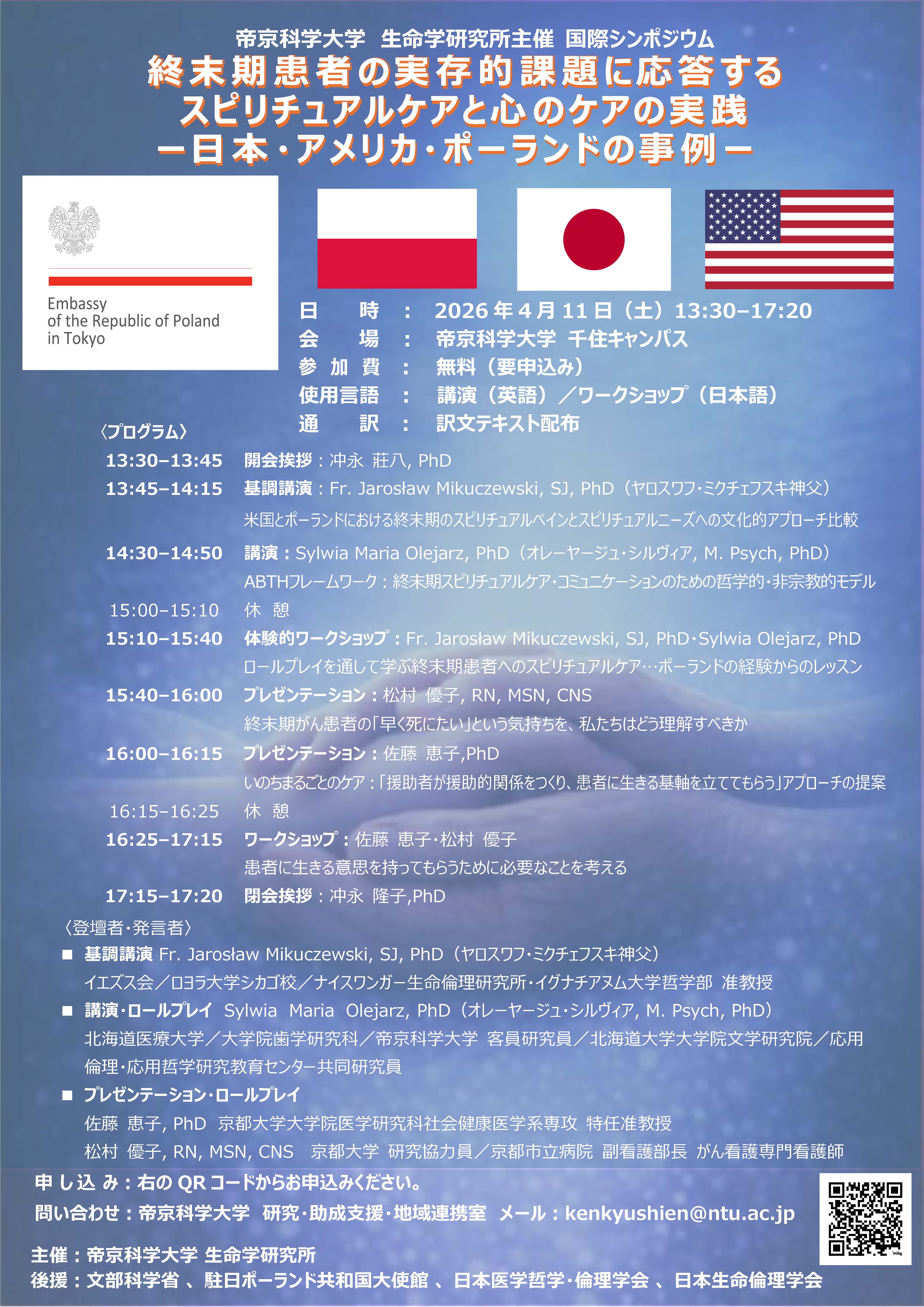 終末期患者へのスピリチュアルケアを、日・米・ポーランドの実践から学ぶ国際シンポジウムを開催します。